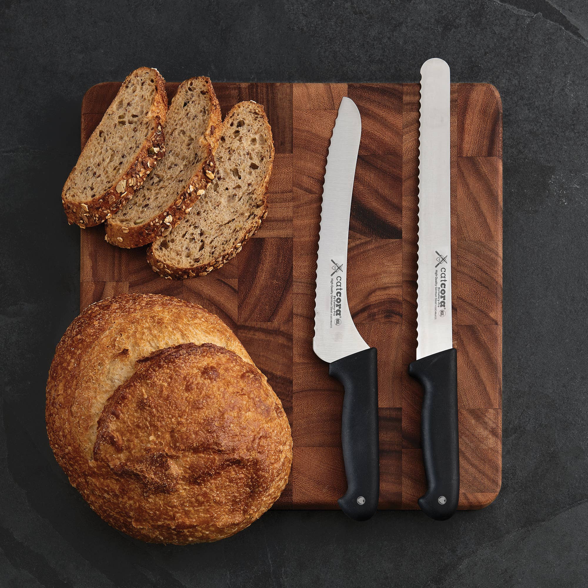 A Bread Slicing Winner, from CatCora by Cutlery-Pro No more squashing or tearing bread with the CatCora by Cutlery-Pro Professional Offset Serrated Bread Knife. Engineered for both home bakers and culinary professionals, this premium 9-inch knife delivers the precise cutting sharpness and control needed for crusty breads and delicate baked goods. Superior Control, Reduced Hand Strain, and Perfectly Sliced Bread German steel alloy for exceptional sharpness and corrosion resistance Ergonomic Santoprene handle for a cushioned, non-slip grip Offset design for optimal clearance and balanced weight for effortless slicing NSF-certified for commercial kitchen use Fully sealed handle to meet the highest food safety requirements and ease of cleaning Versatile for crusty artisan breads, delicate pastries, layered cakes, banana and zucchini breads From Cat's Kitchen to Yours This serrated bread knife is proudly brought to you by Cat Cora, Iron Chef's first female winner and Culinary Hall of Fame honoree, combining p